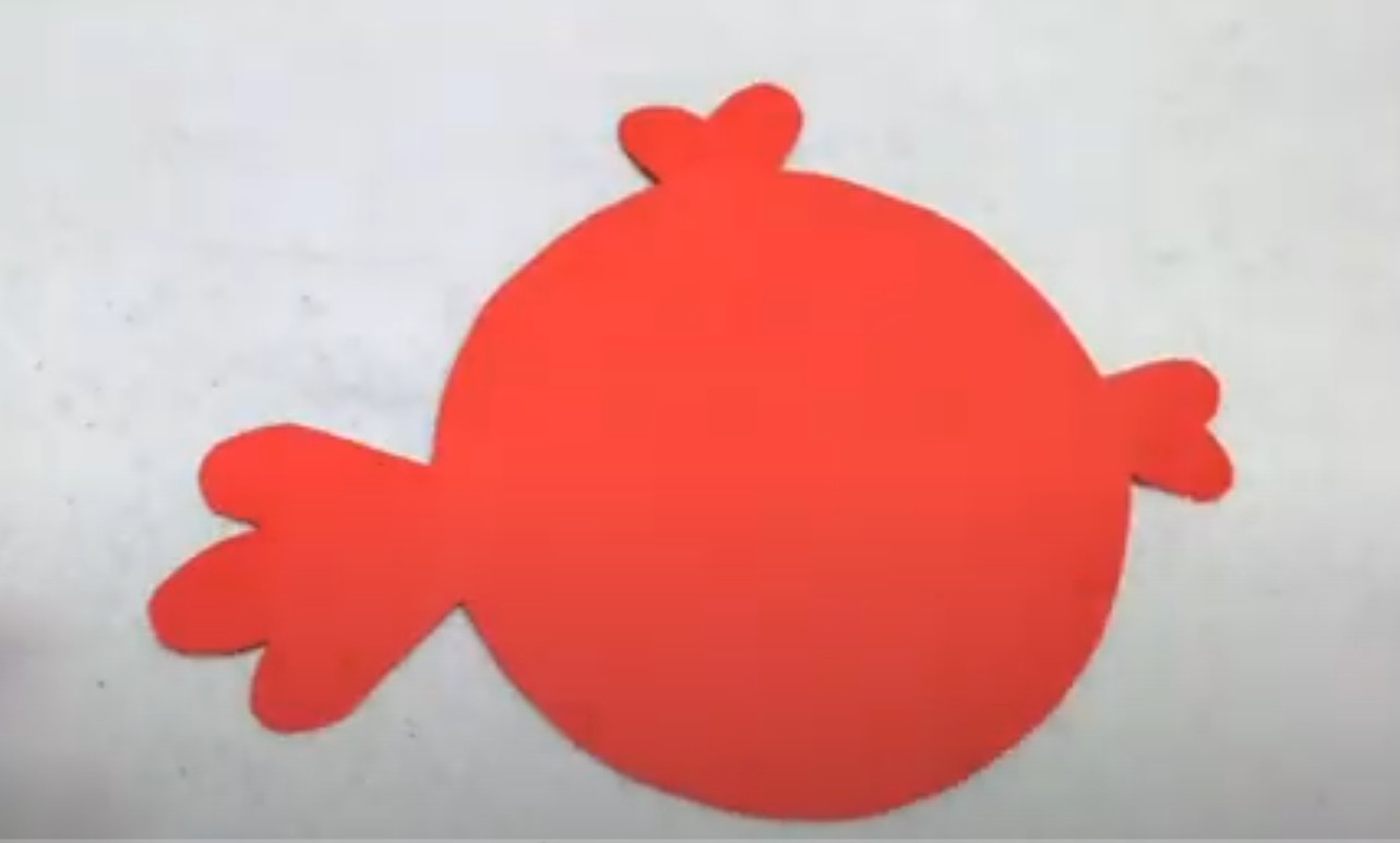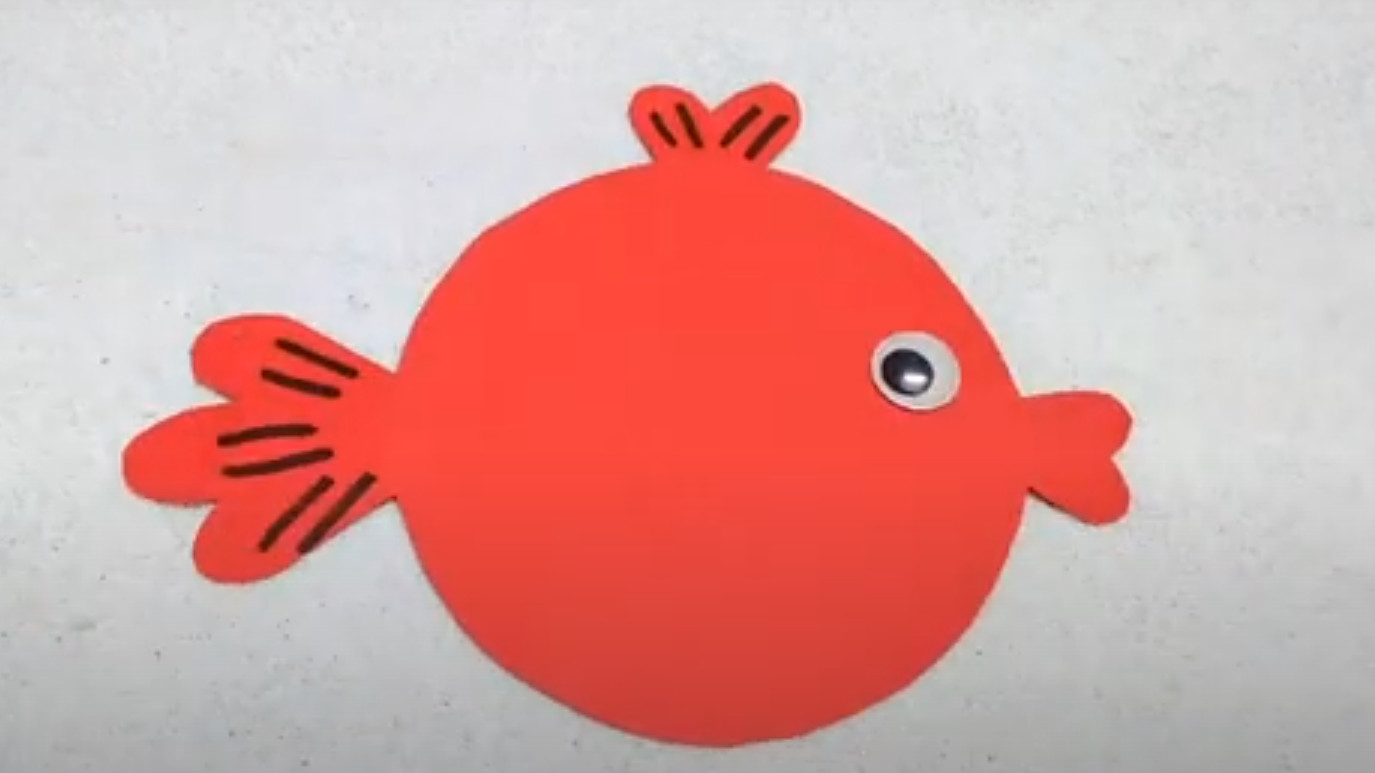 Lấy giấy bìa màu đỏ, dùng compa vẽ một hình tròn đường kính 20cm. Sau đó, chọn 1 vị trí để vẽ miệng, 1 vị trí vẽ vây cá và 1 vị trí vẽ đuôi cá đơn giản rồi cắt thành hình như sau: -